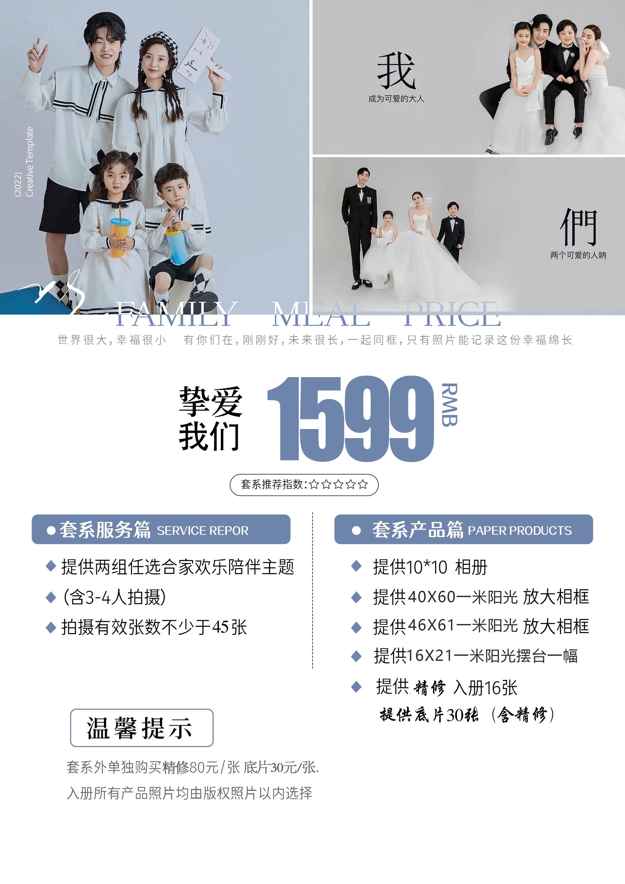 套餐服务 提供两组任选合家欢乐陪伴主题(含3-4人拍摄) 拍摄有效张数不少于45张 套餐提供 提供10*10 相册 提供40X60一米阳光 放大相框 提供46X61一米阳光 放大相框 提供16X21一米阳光摆台一幅 提供底片30张(含精修)精修16张含入册 温馨提示 套系外单独购买精修80元/张 底片30元/张. 入册所有产品照片均由版权照片以内选择