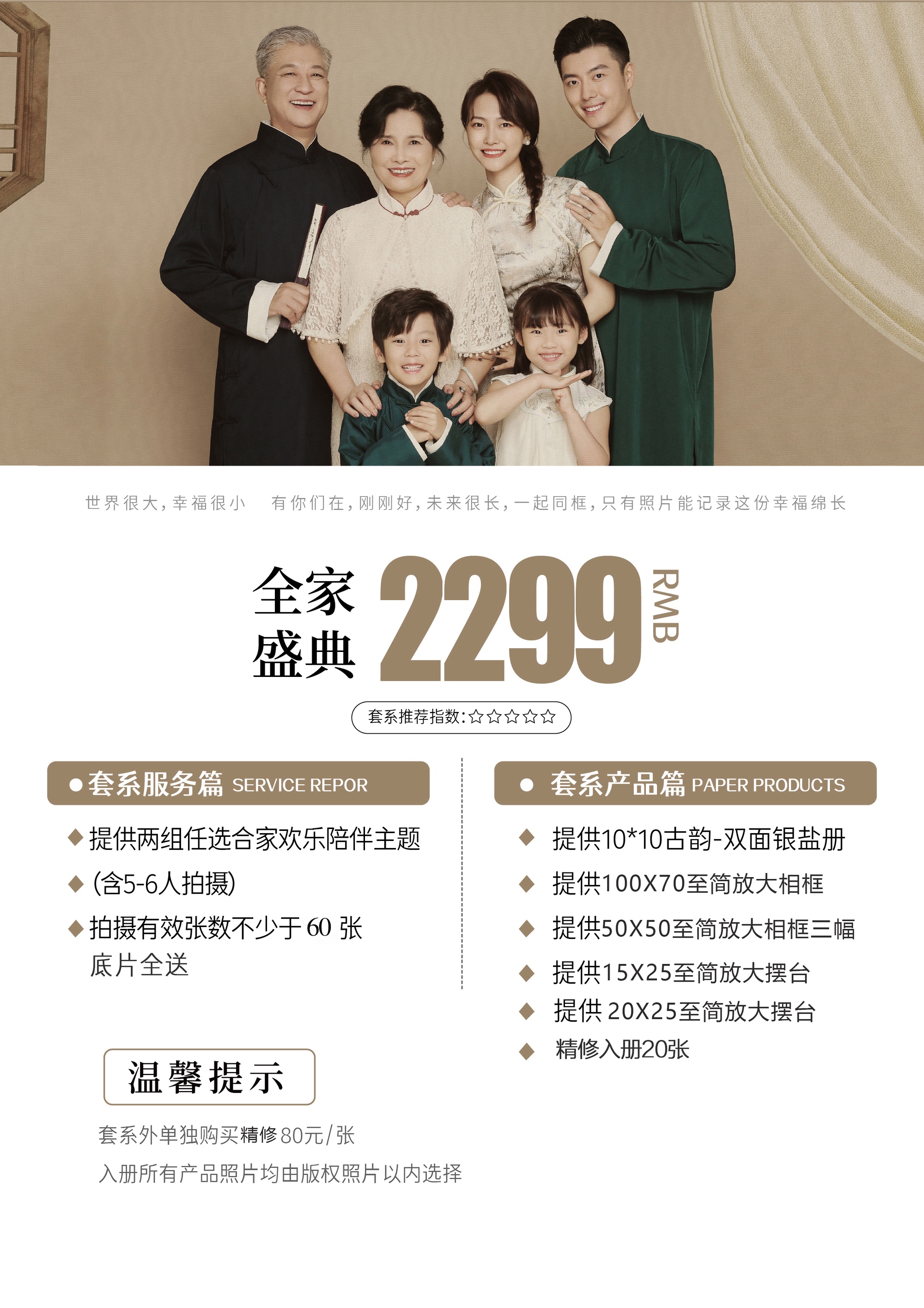 • 提供10*10古韵-双面银盐册 • 提供100X70至简放大相框 • 提供50X50至简放大相框三幅 • 提供15X25至简放大摆台 • 提供20X25至简放大摆台 • 精修入册20张 提供两组任选合家欢乐陪伴主题(含5-6人拍摄) 拍摄有效张数不少于60张 底片全送
