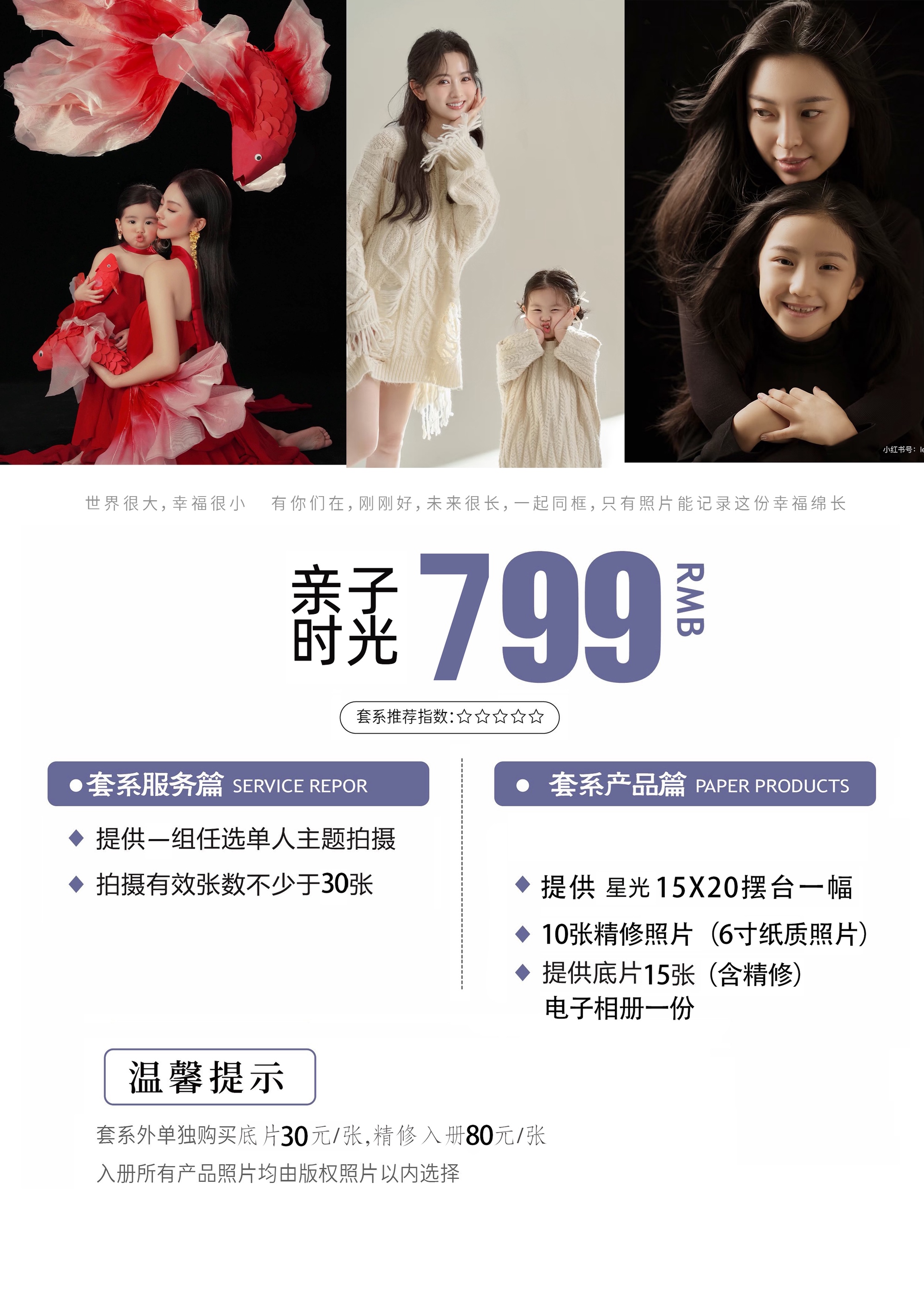 人选一组单人主题拍摄 提供 星光15X20摆台一幅 10张精修照片(6寸纸质照片) 提供底片15张(含精修) 电子相册一份